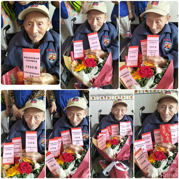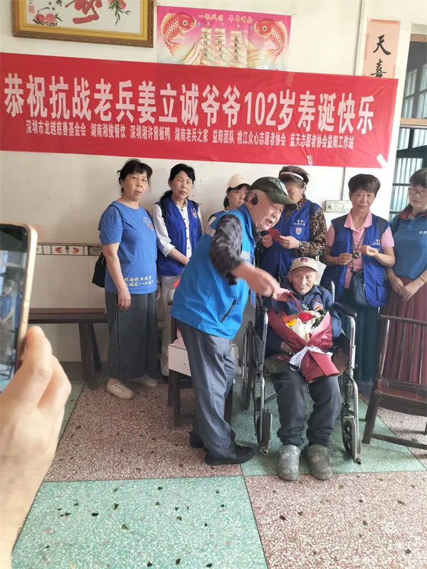 感谢爱心单位深圳市龙越慈善基金会、阿俊迎宾楼、深圳湘许酱板鸭、蓝天志愿者协会益阳工作站和爱心个人李小燕退休教师、新一军新38师后人厦门许先生、桃江已故老兵张合年次子张钢鸣、安化县清塘铺镇志愿者吴双喜、赫山区禁毒协会会长汪正铭敬送的暖心生日礼品和礼金红包!感谢志愿者伙伴们的积极参与,感谢杨振平、颜红飞、凌爱如、蔡师傅开免费爱心车平安往返,关爱抗日老兵,我们永远在路上!