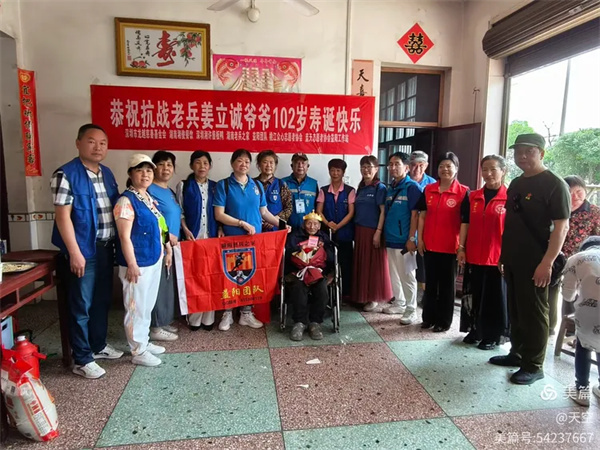 2025年5月3日上午,湖南老兵之家益阳团队、湖南湘俊餐饮、蓝天志愿者协会益阳工作站和桃江自媒体爱如传媒一行20人,带着全体志愿者对抗战老英雄的深情祝福,前往赫山区衡龙桥镇月形村,为原国民革命军第九战区长官司令部参谋处的姜立诚爷爷102岁寿辰举行庆贺仪式!志愿者在厅堂挂好横幅后,由理事虫二主持,为姜爷爷举行了简朴的庆贺仪式。