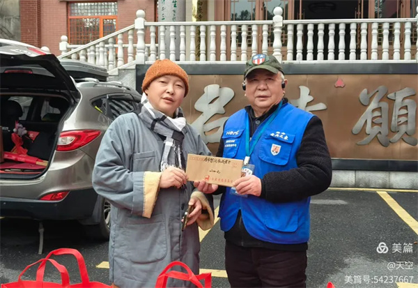 △白鹿寺慈善基金会石悲师向益阳团队天空交接春节慰问抗日老兵的红包