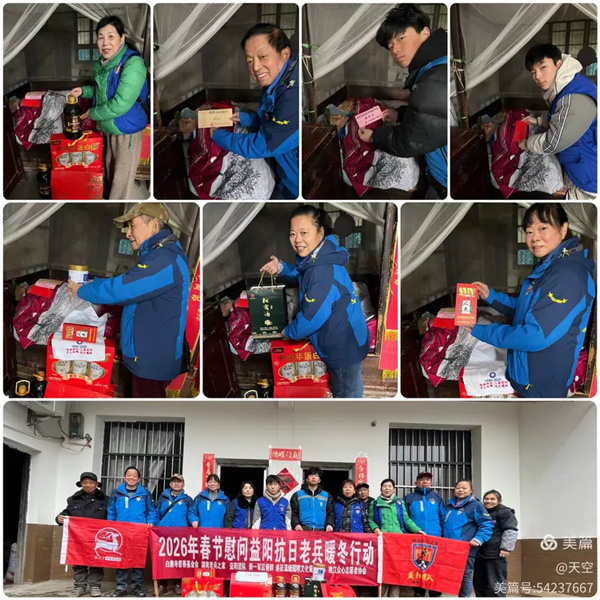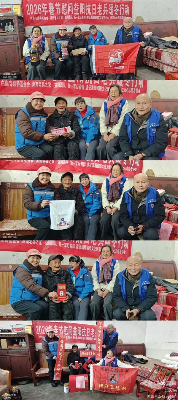 2026年2月7日至9日,在马年春节即将来临之际,湖南老兵之家益阳团队携手白鹿寺慈善基金会、湖南老兵之家、桃江众心志愿者协会,联合开展“2026年春节慰问益阳抗日老兵暖冬行动”。志愿者们深入全市各县区、镇村、街道社区,上门慰问了何振鹏、熊学良、杨奇山、夏贵昌、陈龙飞5位抗日老兵爷爷,为他们送去新春的关怀与诚挚的祝福。