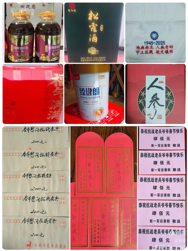 慰问期间,志愿者们为老兵爷爷们逐一送达了各爱心单位及团体捐赠的暖心物资与致敬礼金:白鹿寺慈善基金会敬送礼金红包200元、精品食用油2桶;任佩云爱心基金、湖南老兵之家联合敬送致敬礼金红包200元、礼品包1盒、松鹿酒1对、牛奶粉1厅、春联及感谢信;新一军后裔群敬送致敬礼金红包400元;远征滇缅国际文化策划中心的抗战后人和志愿者敬送抗战胜利纪念毛巾1条;吉林省義勇忠诚公益基金敬送精品东北人参1盒。