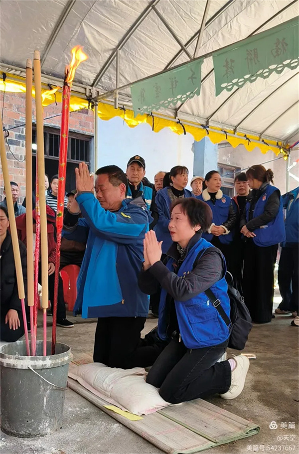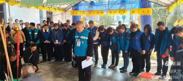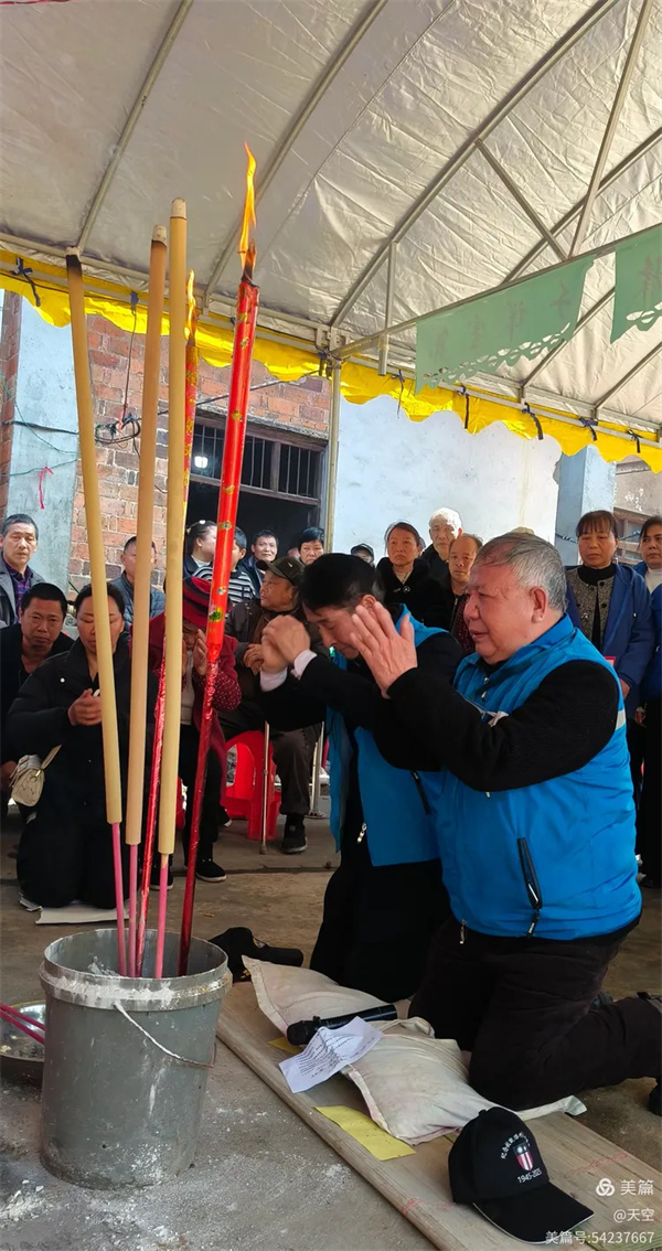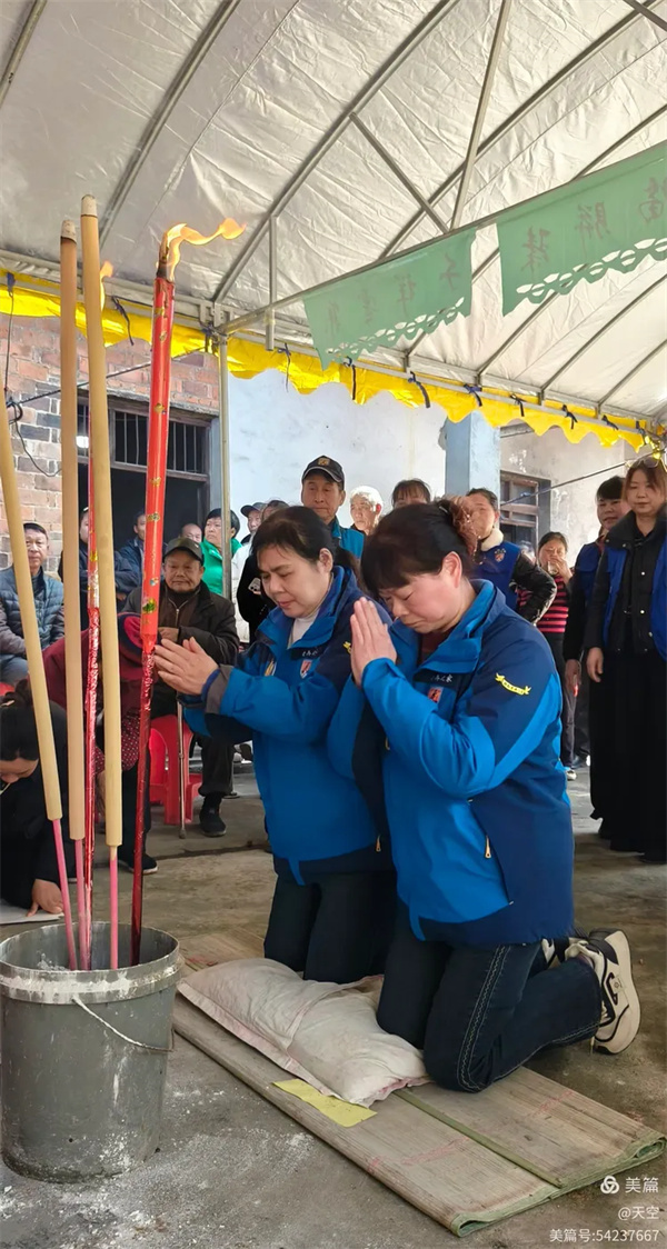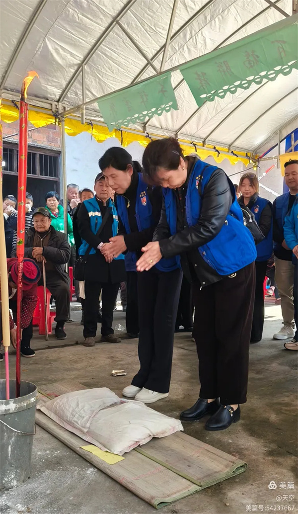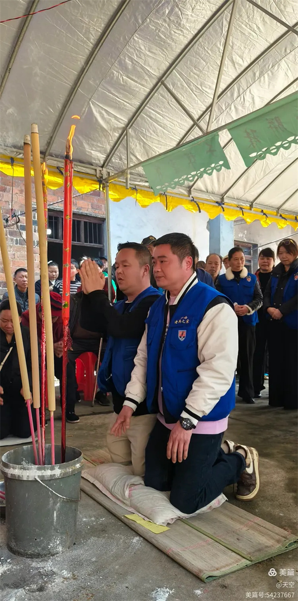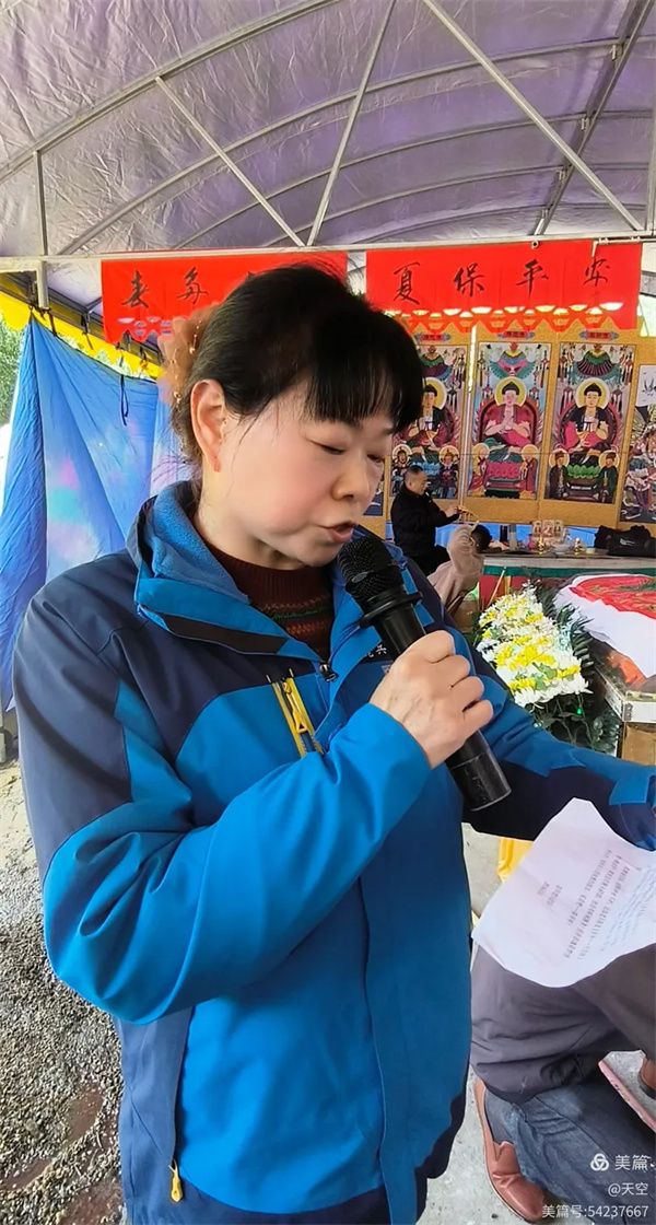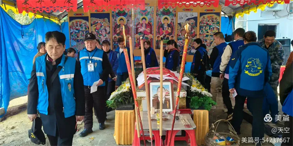 看到村公路旁边搭的拱门及家中的灵棚和棺材,儿孙们为陈爷爷守灵4天,我们看了感到十分的欣慰,在灵堂前挂好横幅挽联后。为陈爷爷举行追思告别会,由天空主持,理事盼盼致悼词: