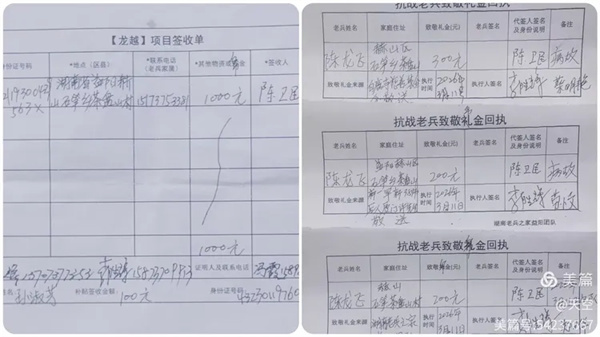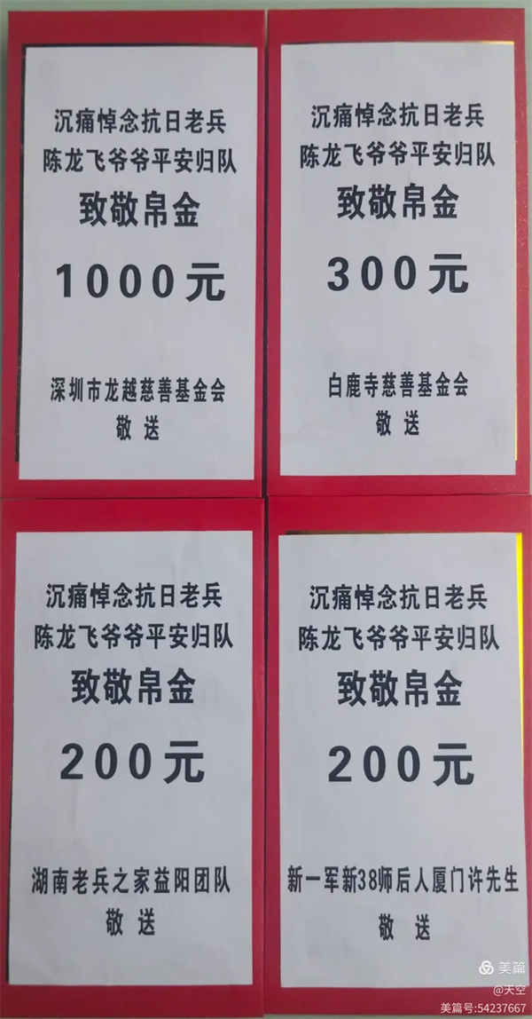 送达深圳市龙越慈善基金会致敬帛金1000元、白鹿寺慈善基金会致敬帛金300元、湖南老兵之家益阳团队致敬帛金200元、新一军新38师厦门许先生致敬帛金200元。益阳团队的花圈、挽联;感谢志愿者何光辉、陈师傅、孟师傅、蔡师傅开爱心车免费车往返!谢谢一线志愿者的积极参与!守护好抗战老兵,益阳团队一直在行动!