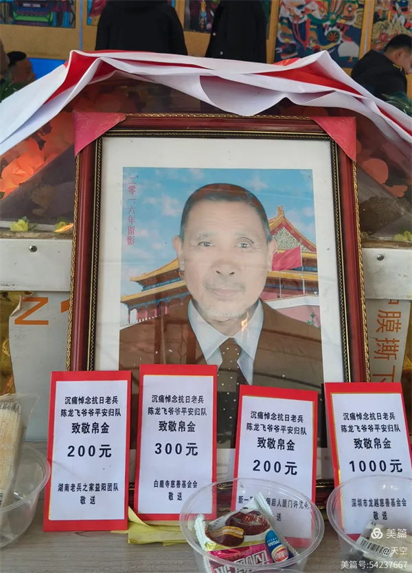 国家没有忘记无数抗战老兵在抗日战争中所做的贡献,2015年,陈龙飞爷爷光荣的获得了中共中央、国务院、中央军委颁发的抗日战争胜利70周年纪念章和慰问金5000元,2025年又光荣获得中共中央、国务院、中央军委颁发的80周年纪念章和15000元慰问金,这是何等的荣耀!自2015年湖南老兵之家益阳团队发现陈龙飞爷爷的老兵身份以来,便一直受到深圳市龙越慈善基金会、湖南老兵之家、益阳团队的关心关爱,每年春节、传统节日、生日和身体不适都有志愿者上门探望,并享受由深圳市龙越慈善基金会发给每月600元的致敬礼金,直到离世!英雄虽归队,但精神永不朽,抗战老兵陈龙飞爷爷……天堂路上您一路走好!那里没有炮火硝烟,也没有疾病缠身!但有你魂牵梦绕的长官,也有你日思夜想的战友,安息吧……陈爷爷!