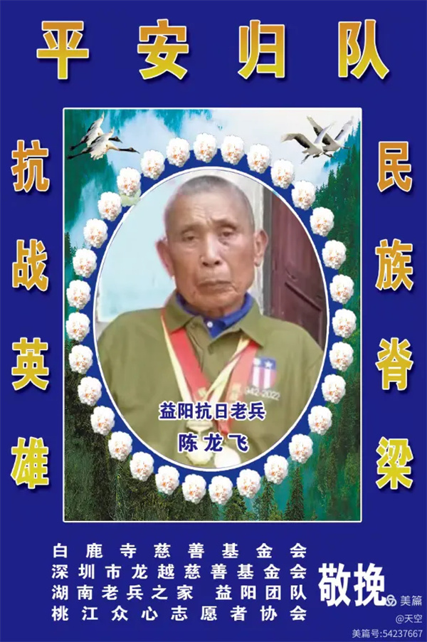 2026年3月11日上午,天气晴朗,湖南老兵之家益阳团队何光辉、陈师付、孟师付、蔡师付、盼盼、天空、虫二、冯霞、文倩、知乐、迎春、丁姐、阿樱、格桑花、燕子、雪中飞舞、大利芝、秋菊、陈飞、彩彩一行21人,受深圳市龙越慈善基金会和长沙市大德抗战老兵关爱中心的委托,大家怀着无比悲痛的心情,前往赫山区龙光桥镇道子坪村吊唁、跪送原国民革命军湖南省警务处特务连直属一中队抗战老兵陈龙飞爷爷最后一程!陈爷爷于2026年3月8日下午8点38分在家中安祥归队,享年98岁。
