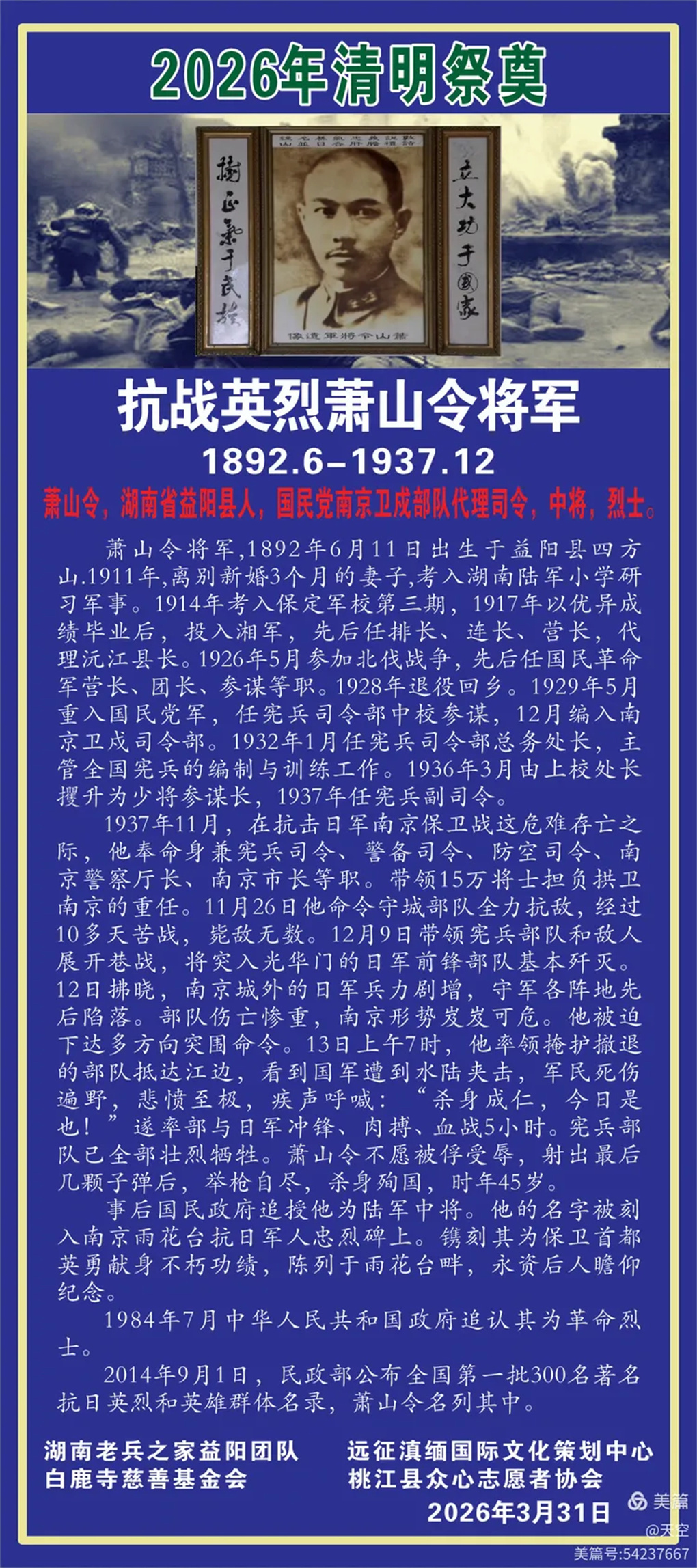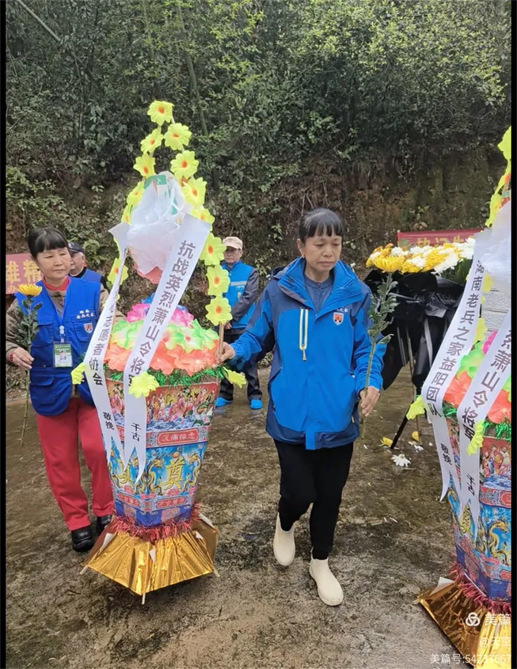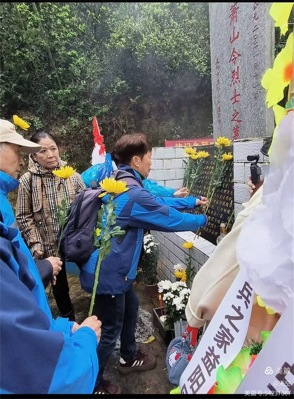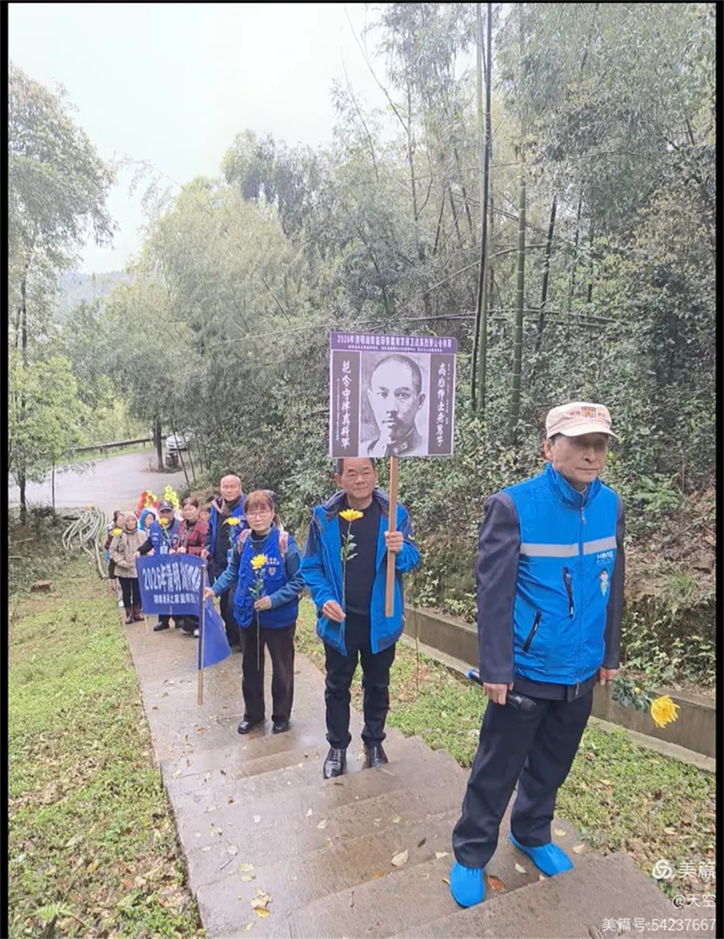 2026年4月3日上午,一年又是清明时,缅怀忠魂寄哀思。湖南老兵之家益阳团队携手远征滇缅国际文化策划中心、桃江县众心志愿者协会一行30人,乘坐6台小车,冒雨前往益阳市赫山区沧水铺镇鱼形山水库环湖公路左侧山上。在抗日英烈萧山令将军墓地,举行“2026年清明湖南益阳祭奠南京保卫战英烈萧山令将军”。每人手持一束黄菊,怀着无比崇敬的心情,聚集在萧山令将军墓碑前,深切缅怀为国捐躯的南京保卫战益阳籍抗战英烈萧山令将军。深切感受到英烈的灵魂和精神正熠熠生辉。这朵朵菊花象征着崇高的品质和无私的精神,也寄托着我们深深的哀思,更代表着我们后辈无限的敬仰,英烈的爱国精神必将永放光彩。英烈的浩气与青山同在,与大地永存!将军垂青千古!感谢益阳花卉商场曹锋先生捐助活动所用的菊花!感谢冯霞、何光辉、青青、郑哥、胡晓斌、钟乐六位开爱心免费车接送志愿者往返!清明祭英烈,益阳团队在行动!