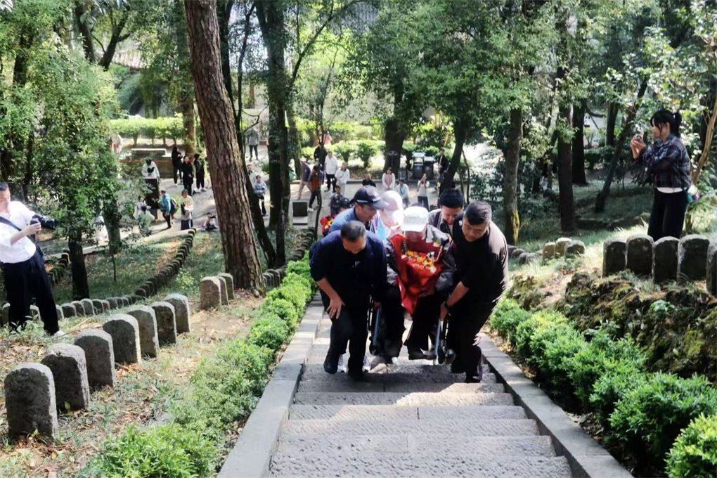 忠烈祠祭奠结束后,老兵们不顾年迈体弱,在家属和志愿者的搀扶下,一步步登上小团坡的108级石阶。另有两位行动不便的老兵,被亲属和志愿者用轮椅小心翼翼地抬上坡顶。在“远征军第二十集团军克复腾冲阵亡将士纪念塔”前,他们肃立凝望,为当年并肩作战、为国捐躯的战友举行祭奠仪式。