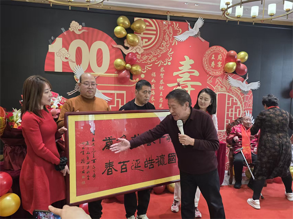 寿宴现场,一幅装裱精致的寿联格外醒目。神州书画院院长徐崇林现场献墨宝、诉深意,上联“忠心报国千秋誉”笔力遒劲,尽显老兵刚毅风骨;下联“皓首延年百岁春”温润如玉,传递寿辰祥和暖意。这幅专为王忠老英雄量身创作的寿联,以笔墨为媒,浓缩了老人从烽火岁月到和平年代的百年峥嵘。