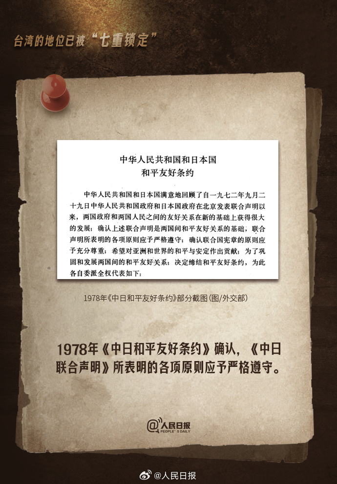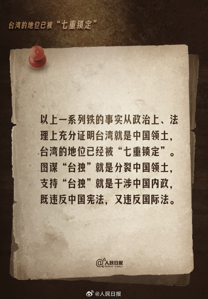 从《开罗宣言》到《波茨坦公告》,从第26届联大2758号决议到《中日联合声明》……一系列铁的事实从政治上、法理上充分证明台湾就是中国领土,台湾的地位已经被“七重锁定”。