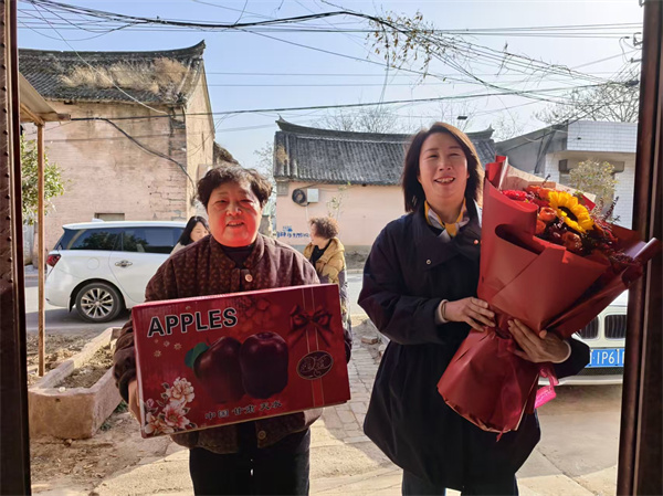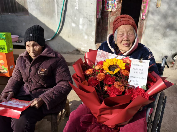 郏县团队情人节为抗战老兵叶青志伉俪送鲜花和苹果点心礼品。