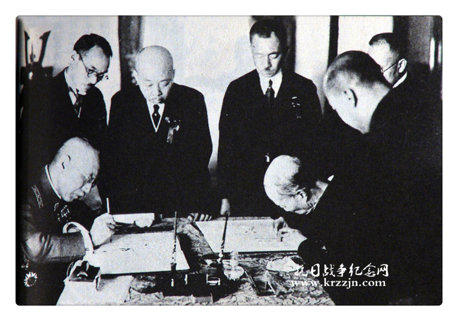 1932年9月15日,日本关东军司令官武藤信义(左)与伪满洲国国务总理郑孝胥(右)签订《日满议定书》。中国东北沦为日本的殖民地。图为《日满议定书》签字现场。