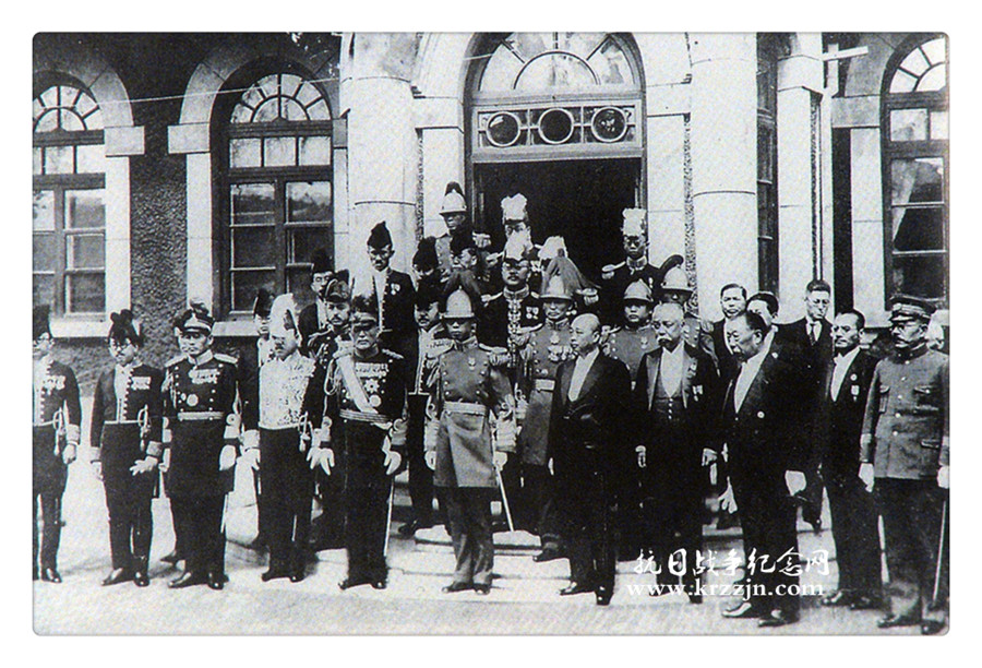 1934年3月,日本将所谓的“满洲国”改为“满洲帝国”,溥仪由“执政”变成了“皇帝”。图为溥仪与真正的统治者关东军司令官菱刈隆(左五)等合影。
