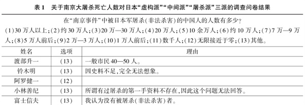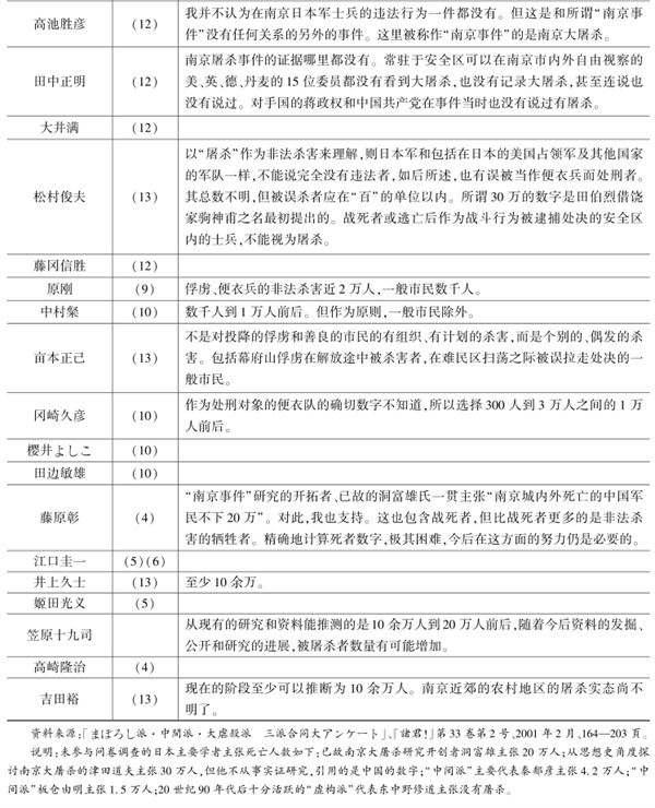 东京审判被告方完全否认屠杀,检方提交的证据中推定屠杀26万人,法庭判决为20万人以上。数字问题成了20世纪80年代后日本关于南京大屠杀争议中的重要争论点。“虚构派”与辩方一样,完全否认屠杀;“中间派”主张的数字在数千至4万余人之间;“屠杀派”主张的数字为10万至20万人之间(参见表1)。