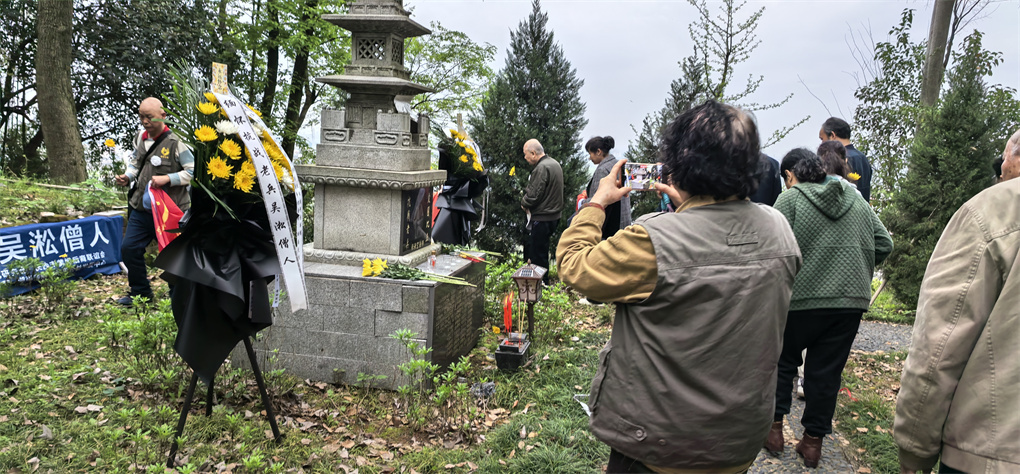 祭奠仪式现场,庄严肃穆,松柏凝翠。黄埔后裔合唱黄埔军校校歌,吴淞后人、长沙市黄埔后裔联谊会副会长吴晋上香、祭酒,湖南省黄埔军校同学会副会长刘园宣读祭文。祭文中饱含对吴淞先生一生的追思:赞扬他青年时期勇赴国难、浴血沙场的爱国情怀,敬佩他晚年归隐古刹、不忘初心、为战友守灵的赤诚之心,更缅怀他用一生践行的家国情怀与民族大义。