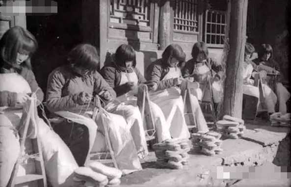 妇女能顶半边天,她们的作用同样重要。图为妇女们为前线战士赶做鞋子。