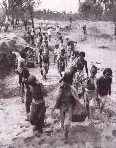 儿童团员们为了支援抗日,积极开完开挖水塘生产自救。