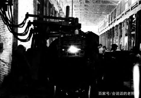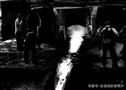 中国的钢铁厂。熔化的铁水从高炉底部流出