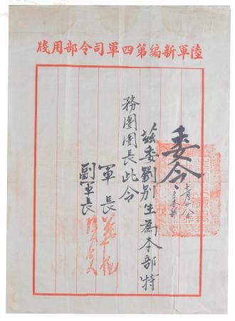 刘别生的新四军本部特务团委令用毛笔书写在“陆军新编第四军司令部用笺”的毛边纸上,上面书写“委令 兹委刘别生为本部特务团团长 此令”,左下方有军长叶挺、副军长项英的红色签名章,右中部盖有“陆军新编第四军军部关防”红印章。
