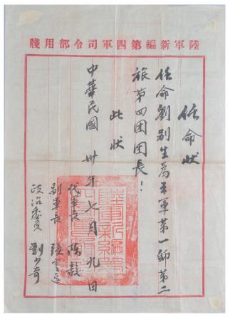 刘别生的新四军第一师第二旅第四团团长的任命状用毛笔写在“陆军新编第四军司令部用笺”的毛边纸上,上面书写“任命状 任命刘别生为本军第一师第二旅第四团团长 此状 中华民国卅年七月九日”,左下方盖有“陆军新编第四军军部关防”红色印章,并有代军长陈毅、副军长张云逸、政治委员刘少奇的签名。