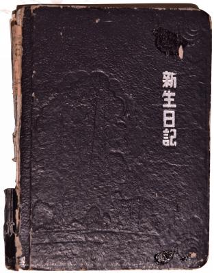 刘别生的笔记本封面、封底为黑色,封底左侧有烫金字“新生日记”,脊背处有些破损。翻开笔记本,内页也部分有脱落,只有少许页数有文字内容,多处贴有塑料纸,其中有一处放着一张刘别生的黑白全身照。