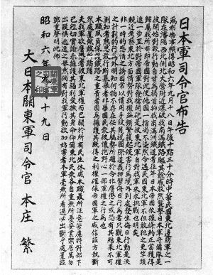 ▲日本关东军司令本庄繁发布的安民告示,在“九一八”第二天的上午就挂满沈阳街头。日军若不是早有准备,不可能在一夜之间完成这些布告。