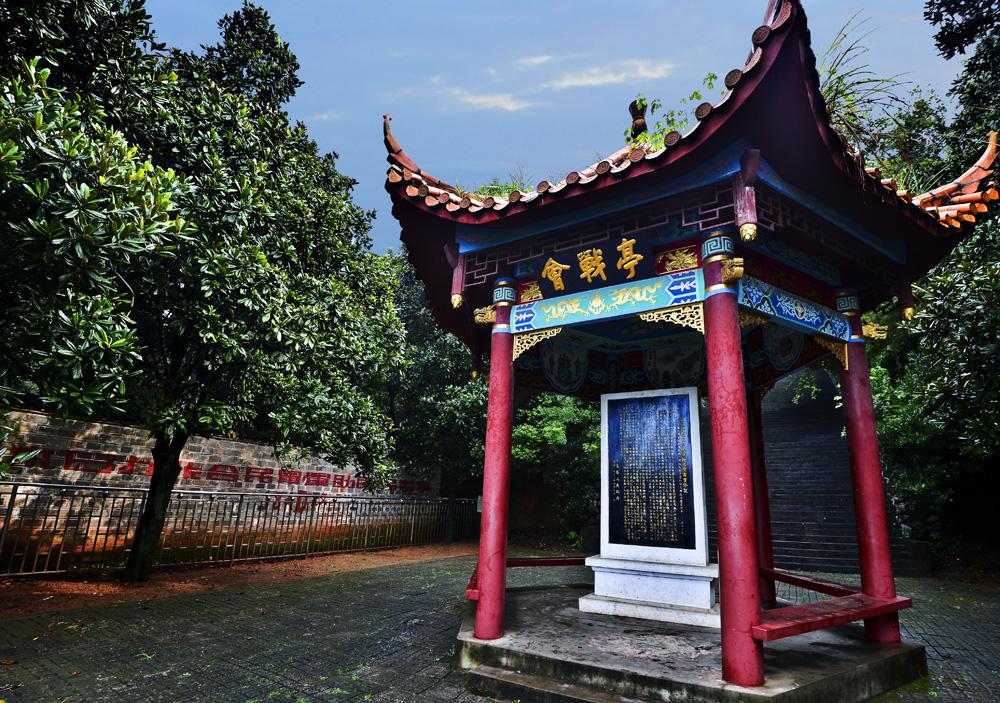 陵园中部有一仿古凉亭名为“会战亭”,亭内有一青石碑,碑文刻“上高会战抗日阵亡将士陵园重修记”,会战亭东侧立石碑数块,上刻有上高会战总指挥罗卓英将军的赣北大捷四首诗词,会战亭西侧立有一堵上高会战时留下的抗日标语墙,上写“军爱民,民拥军,军民合作打日本”。