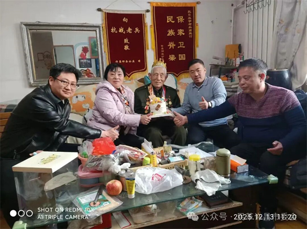 陆鸽主委代表民革许昌市科技支部向老人送上精心准备的生活用品、营养品等慰问物资,并为其点燃生日蜡烛,共同唱响生日祝福歌。在举国铭记历史、缅怀英烈的国家公祭日,为抗战老兵庆祝生日,不仅体现了对历史伤痛的深刻铭记,更是对英雄前辈的崇高礼敬与温暖关怀。老人深受感动,对组织的持续关爱表示衷心感谢。