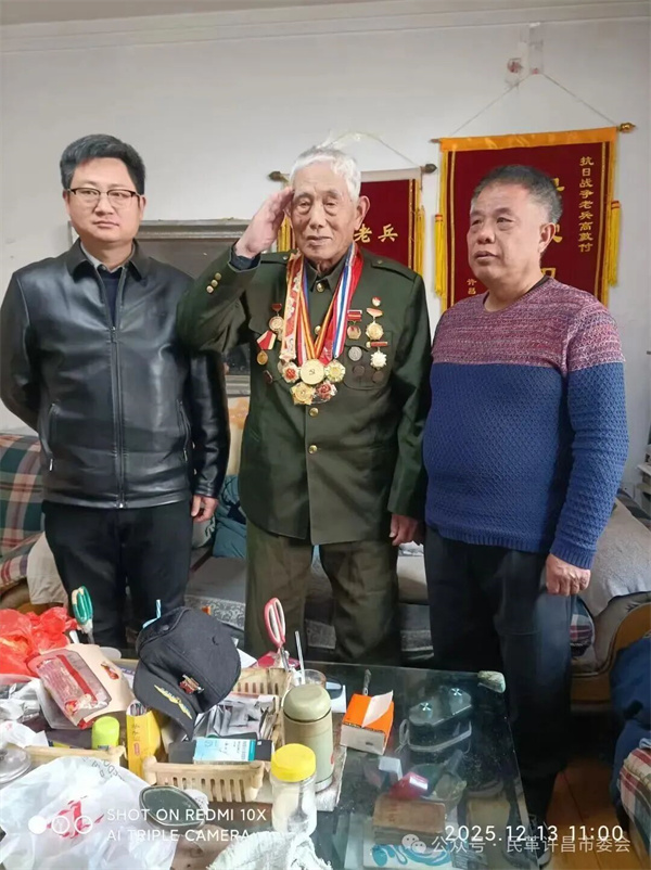 12月13日,是南京大屠杀死难者国家公祭日。在这个寄托民族哀思、铭记沉重历史、宣示和平信念的庄严日子里,民革许昌市科技支部主委陆鸽、民革许昌市文化艺术支部主委杨轲和部分支部党员,怀着对历史的深刻警醒与对抗战老兵的崇高敬意,专程看望93岁的抗战老兵高敦付,向老人致以诚挚的生日祝福并送上慰问品。