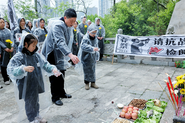 △清明期间,家人和志愿者们到江西宜春老爷爷烈士墓前祭奠