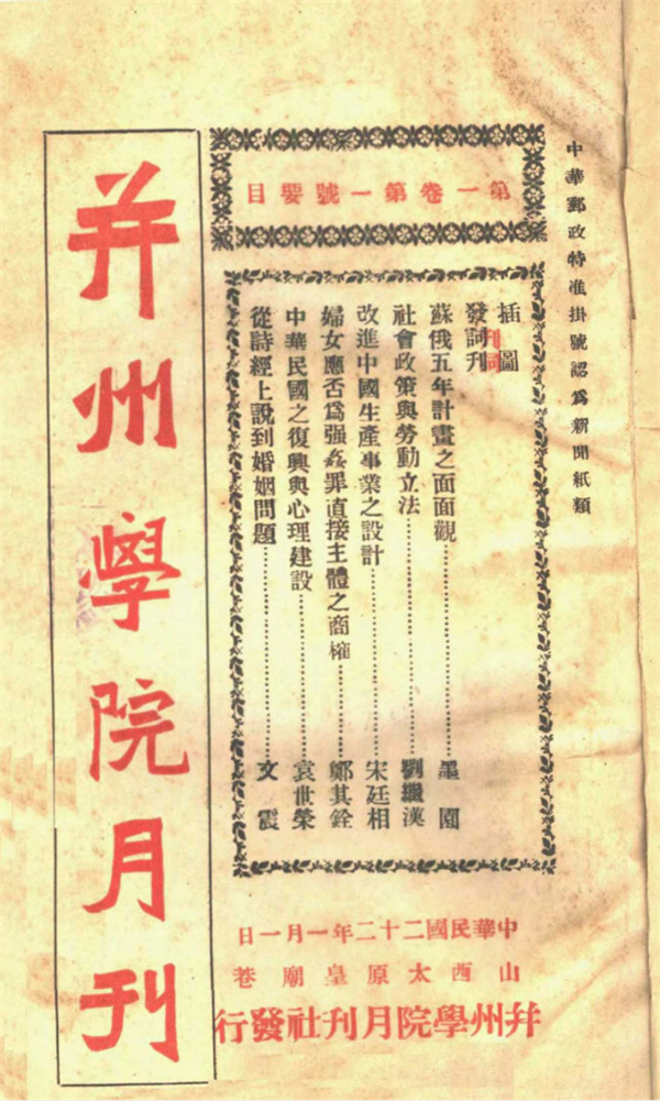 并州学院设文学、政治、法律等系科,月刊依托学院资源,以“发扬文化、阐明科学”为宗旨。学术研究上,刊载多领域师生成果,如文学类《中国文字学之意义》、政治学类《革命政府工作人员最低限度之要项》、法学类《东西各国离婚制度比较观》等;在社会问题方面,聚焦现实议题,《农村破产与其救济》探讨农村困境,《夏历年关的歌谣》记录民俗,《内政上卫生行政之急要》关注公共卫生。