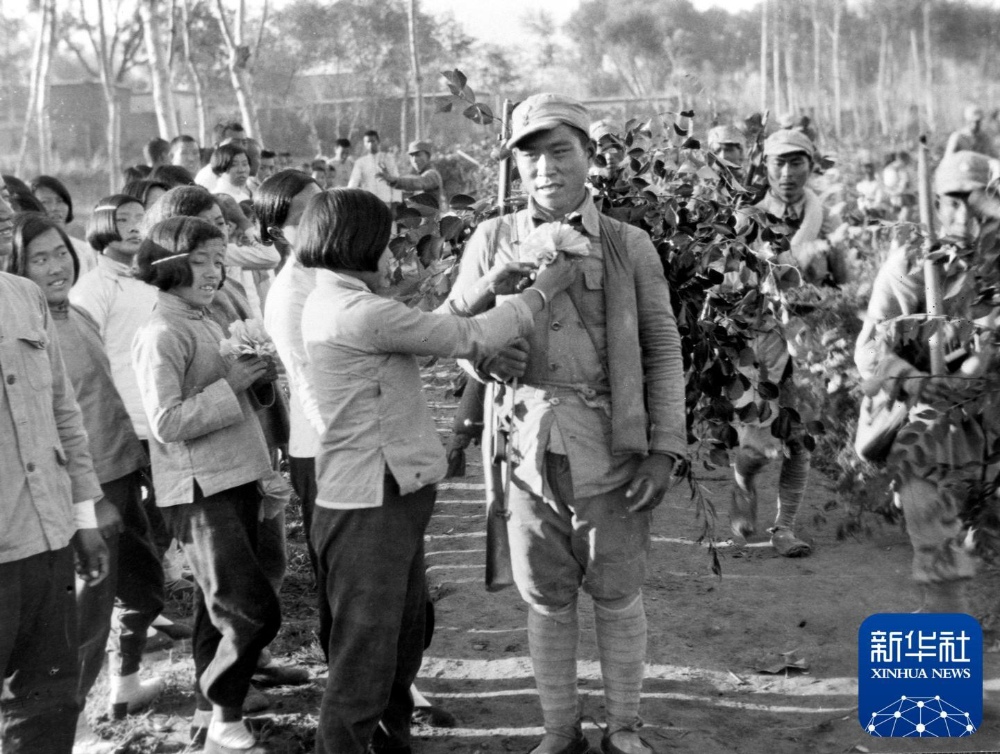 ▲民众为百团大战胜利归来的英雄戴光荣花。