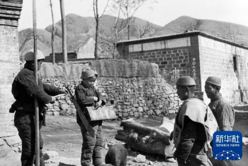 ▲抗战时期,敌后抗日根据地儿童团的孩子在站岗放哨时教路过的乡民识字“加紧春耕”。