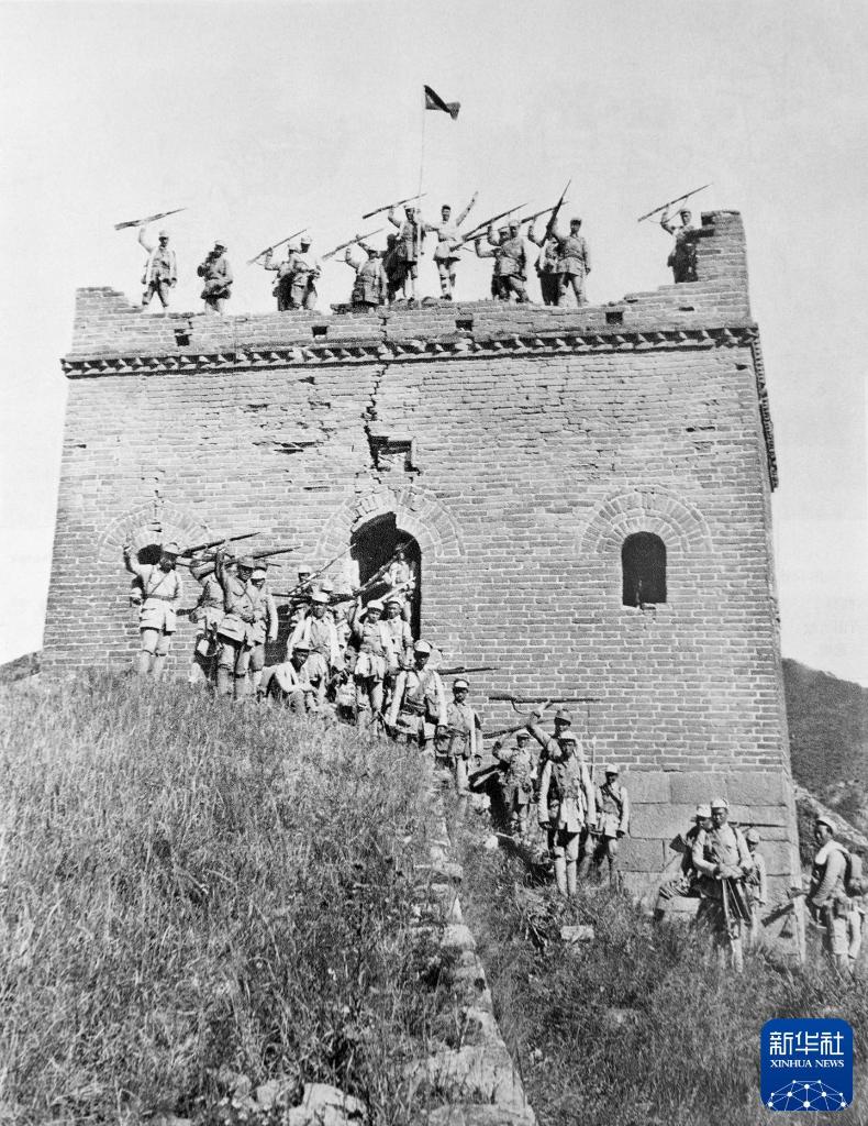 ▲1940年8月,八路军攻克河北涞源县日军据点东团堡,战士们在长城烽火台上欢呼胜利。