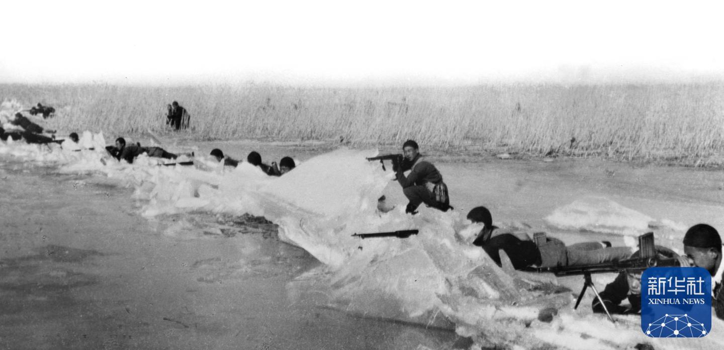 日军趁白洋淀湖结冰时围攻我军,雁翎队战士们以积冰为掩体,向敌人猛烈还击。