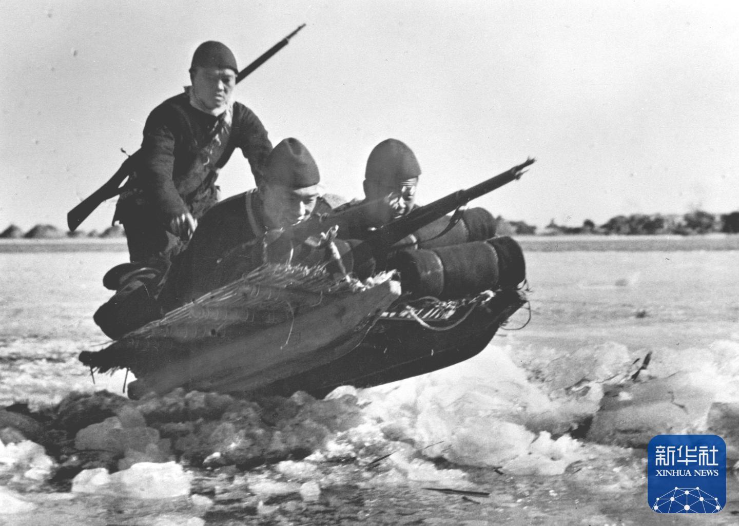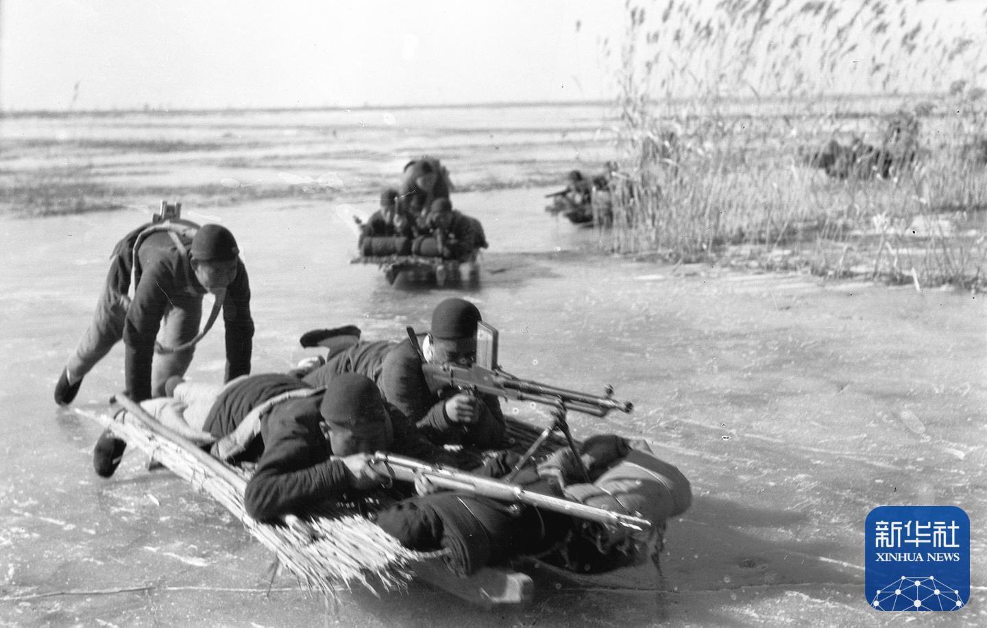 白洋淀雁翎队里的“土坦克手”,在冰上出击。