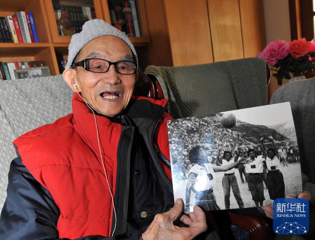 2008年4月3日,徐肖冰老人向记者介绍他1943年在延安拍摄的延安大学女子排球队比赛时的照片。新华社记者 何俊昌 摄