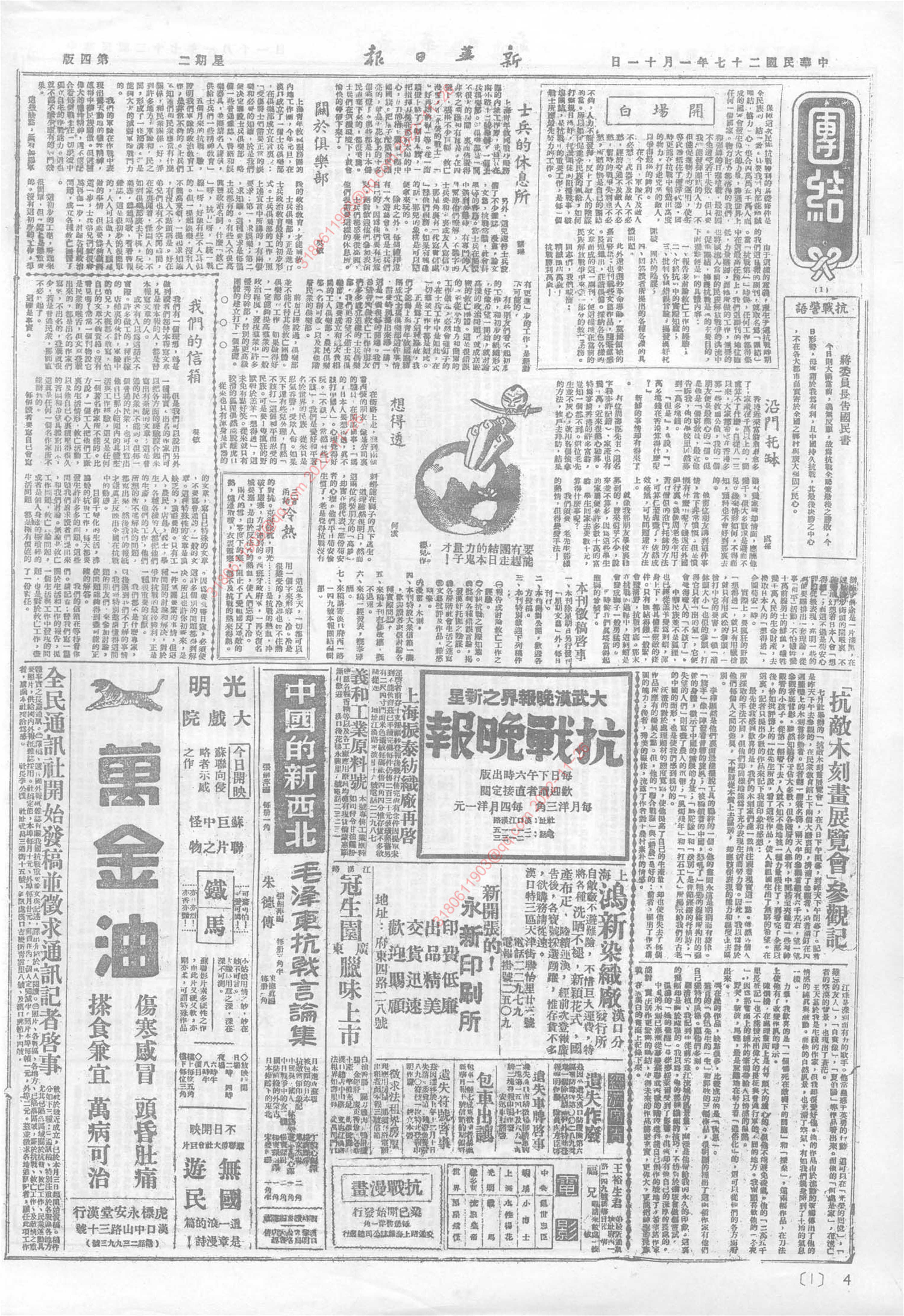 《新华日报》最早在抗日战争时期和解放战争初期(1938年1月11日-1947年2月28日)是中国共产党的大型机关报,它是由周恩来等老一辈无产阶级革命家在河北涉县一二九师司令部亲自创办的、中国共产党第一张在全国公开发行的报纸并一直持续至1947年2月28日。1937年,国共开始第二次合作。中国共产党与国民党当局商定,在南京公开发行中共党报《新华日报》。但是因为顽固派阻挠及日军逼近,报社被迫迁至武汉成忠街53号。延至1938年1月11日,《新华日报》正式在武汉创刊。正式创刊后,报社迁至汉口大陆里。发行部则设大陆里临街的平房内(原建筑已改建)。该报在武汉期间,属中国共产党长江局领导。