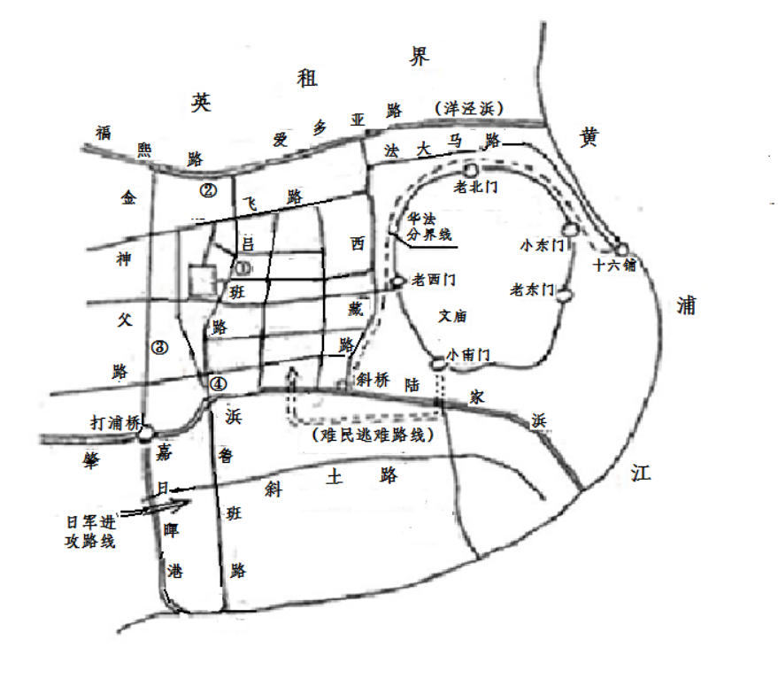 813事变时我七岁,我全家原居住在南市一条叫“同仁坊”弄堂内。虽说淞沪战争的主战场是在苏州河以北和江湾一带,但战争打响后日军的飞机天天来南市轰炸,造成严重伤亡。在开始阶段日机遭到中国空军英勇阻击;但中国空军飞机数量远少于日寇;到了10月,中国空军的飞机损失殆尽,日机就肆无忌惮地对南市狂轰滥炸,致使大批民房变成废墟,数万难民露宿街头,饿殍遍街。我家的房屋也遭轰炸,全家沦为难民。在国际救济组织要求下,法租界只答应将老北门的铁门开启一角,还限定每天的时间和人数。大批难民包括我家五口人,只得向南走,绕道越过肇嘉滨逃进租界。当时的肇嘉滨是条小河沟,也是华法的边界。租界当局在河沟北岸筑有铁丝网,每隔几里地还筑有炮台。但防备较松,尤其是大多法警同情中国抗战,他们眼开眼闭。于是大批难民就冒险趟水过河,在卢家湾一带上岸,钻过铁丝网后逃进租界(见图1)。当时我家五口在母亲带领和指挥下一个个钻过铁丝网,进入法租界地区。我们又随大伙站到沟边的高地遥看远处的斜土路。只见一队队的鬼子兵,一个个端着步枪和明晃晃刺刀,跟在一辆辆坦克后面疯狂地向东奔跑。大家担心还有不少乡亲是否也已躲进租界避难;担心我们的子弟兵能否遏制住野蛮的日本鬼子。然后我家就和几户山东籍老乡一起,沿着吕班路(现重庆南路)赶紧奔向位于法租界西门路(现自忠路)的山东会馆,被会馆收容。
