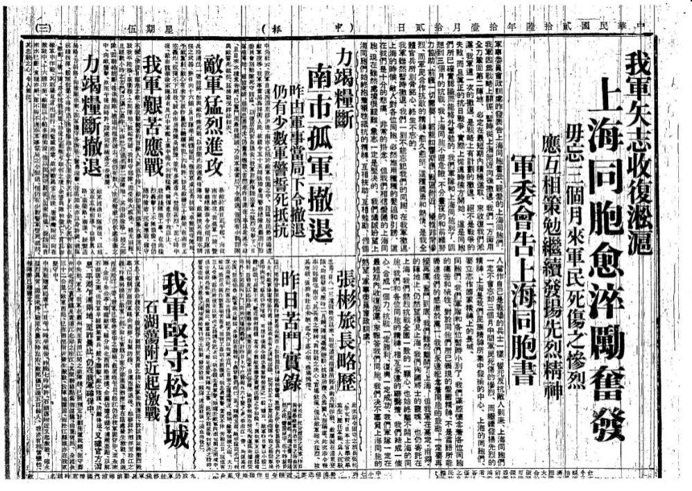 (3)蒋介石指挥失误,导致淞沪战争发生转折;导致发生上海南市保卫战;是个不可原谅的低级错误;