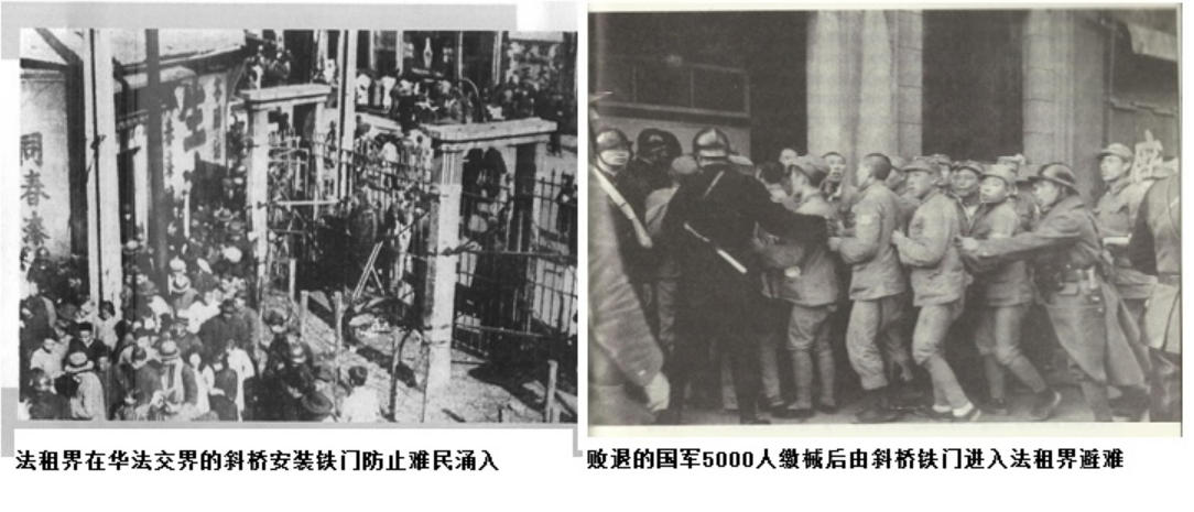 图3 左图为法租界在斜桥安装铁门防止难民涌入。右图为南市保卫战后撤退的中国士兵由斜桥进入法租界寻求庇护。