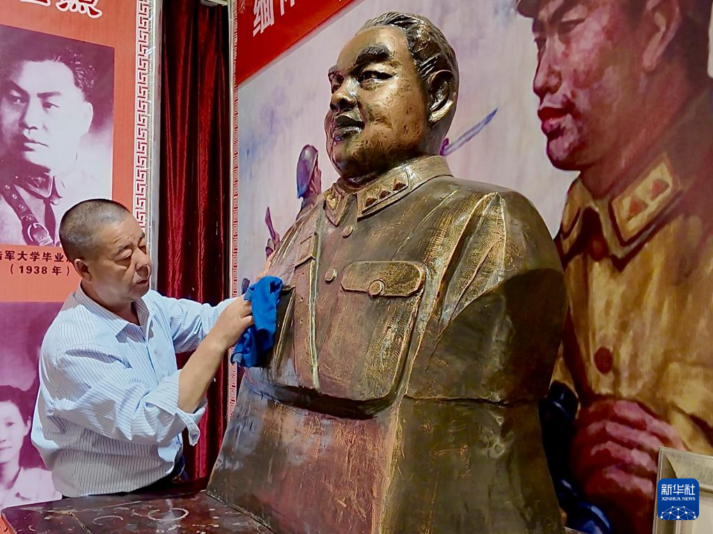 7月14日,富源胜境博物馆馆长潘庭宏在擦拭博物馆内王甲本的塑像。新华社记者 熊轩昂 摄