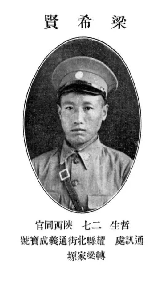 梁希贤,1898年出生在陕西同官(今陕西省铜川市)黄堡镇梁家塬村。据村里老人回忆,梁希贤自小就受英雄人物故事的影响,立下了报效国家的志向。1925年,他不顾家人反对,告别地处内陆的家乡南下广州,于1926年3月考入黄埔军校第五期。