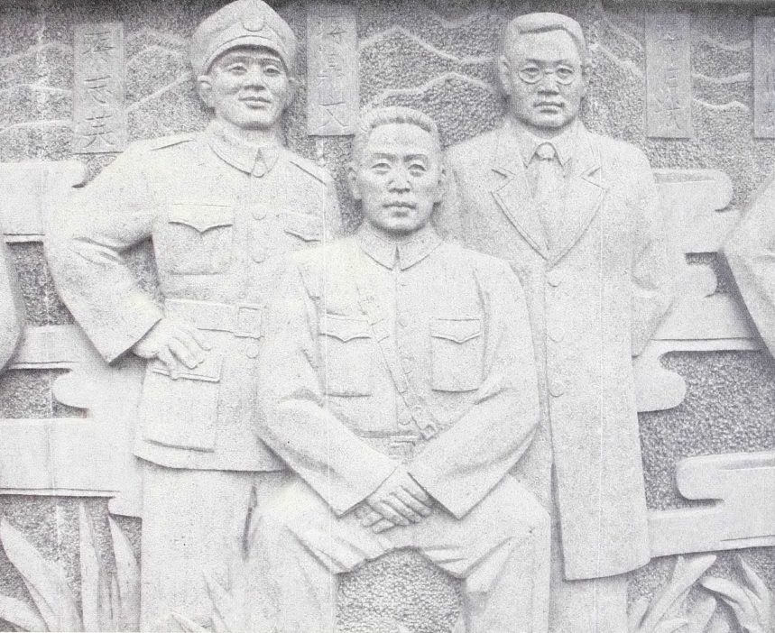 图为诸暨市浬浦镇盘山村的抗战英雄浮雕像,左一为蒋志英(资料照片)。新华社发(诸暨市委宣传部供图)