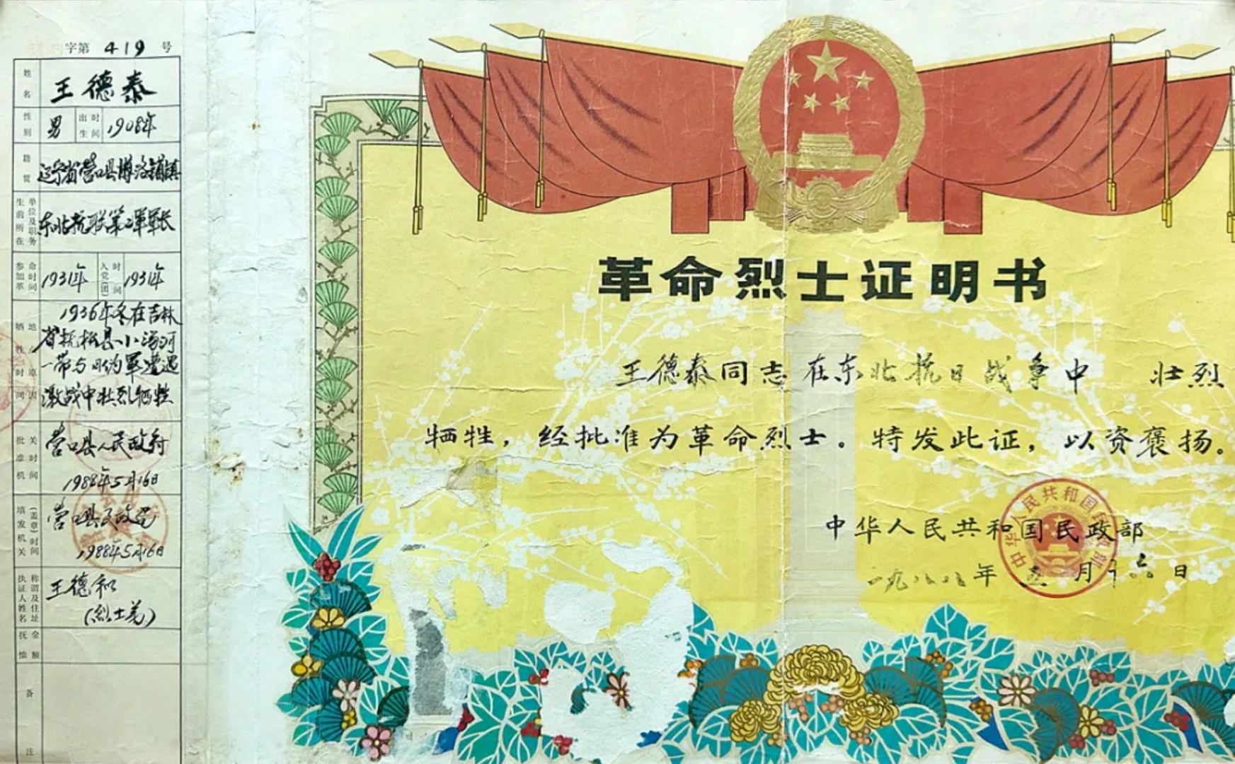 王德泰的革命烈士证明书