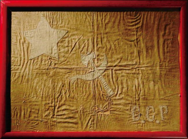 这面制作于1939年的党旗,是中共中央山东分局几位妇女干部缝制的。党旗的设计模仿了苏联共产党党旗的样式,长80厘米,宽40厘米,旗面为红褐色,左上方有一颗黄色的五角星,中央偏左上方有一个黄色的镰刀斧头图案,右下角是中国共产党的英文缩写。这是山东省内现存最早的一面党旗。