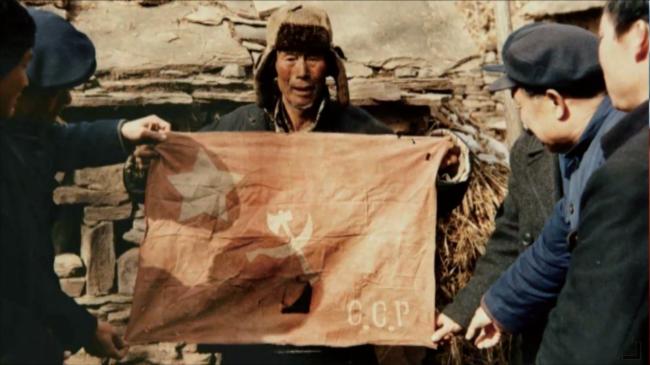 刘洪秀以走村串户卖货作掩护,秘密发展党员。他向乡亲们宣传党的抗战决心,让乡亲们相信,中国共产党是一个心系百姓安危、能让百姓翻身解放的党。在低矮的草屋里,刘洪秀带领新党员在这面党旗下宣誓,他们握紧右拳高举,立下“永远跟着党走”的誓言。