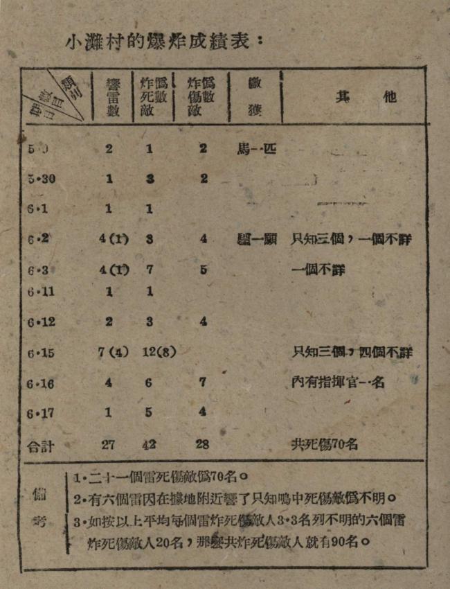 这份档案,是胶东军区政治部在1945年11月《前线报》上刊登的海阳地雷战成绩表,详细记录了海阳县(今海阳市)小滩村使用自制土雷打击敌人侵略的战绩。