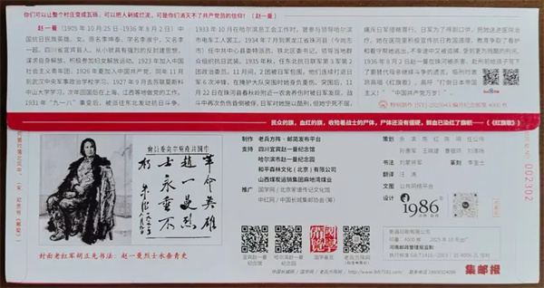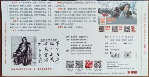 2025年是抗日民族女英雄赵一曼诞辰120周年。10月25日,由中共宜宾市委宣传部、宜宾市文化广播电视和旅游局主办,宜宾市赵一曼纪念馆承办的纪念抗日民族女英雄赵一曼诞辰120周年纪念仪式活动在赵一曼纪念馆一曼广场举办。老兵方阵·邮简发布平台策划印制的4000枚《英雄赵一曼》纪念邮简,在这次纪念活动首发。