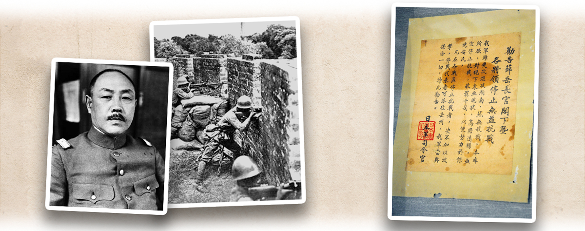 △左图:第二、三次长沙会战,日军皆由阿南惟几指挥;中图:日军第三次攻打长沙;右图:第三次长沙会战,日军致书第九战区司令长官薛岳,“劝告薛岳长官阁下暨各将领停止无益抗战”。