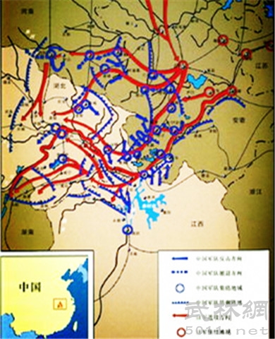 在武汉会战地图上,中方的力量多在长江南岸作战,沿着鄱阳湖部署兵力。国民政府以南昌作为自己的基地与日军展开攻势,而第二兵团的兵力部署在九江到瑞昌一线,防止日军迂回包抄,在沿江一带构筑阵地带,防御工作做得非常的严密。第五战区在武汉会战地图中江北一侧,利用长江北侧的大别山脉的丘陵湖有效遏制敌人,并且在太湖、潜山西北的地方同样布有兵团,便于南下进攻日军,参战兵力的左翼放在了大别山的北侧和淮河之间一线,用于阻击敌人。